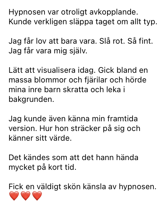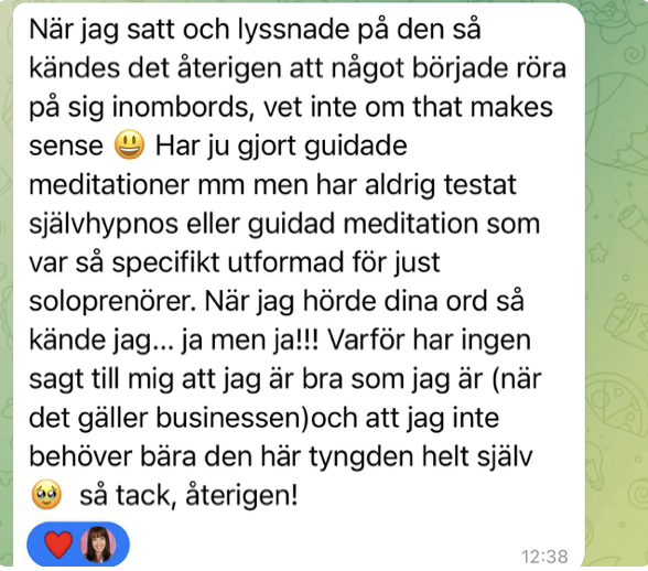 I självhypnosen kändes det som att orden gick rakt förbi tankarna och nådde något inom mig som jag inte riktigt varit i kontakt med på länge. En mjuk påminnelse om att jag inte behöver bära allt själv och att jag faktiskt duger precis som jag är. Tack för att du skapat något så innerligt och fint. Det här borde fler få uppleva."